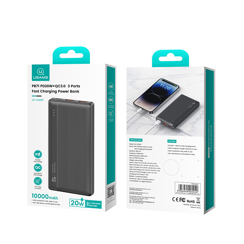 PB71 PD20W+QC3.0 3 Ports Fast Charging Power Bank 10000mAh
