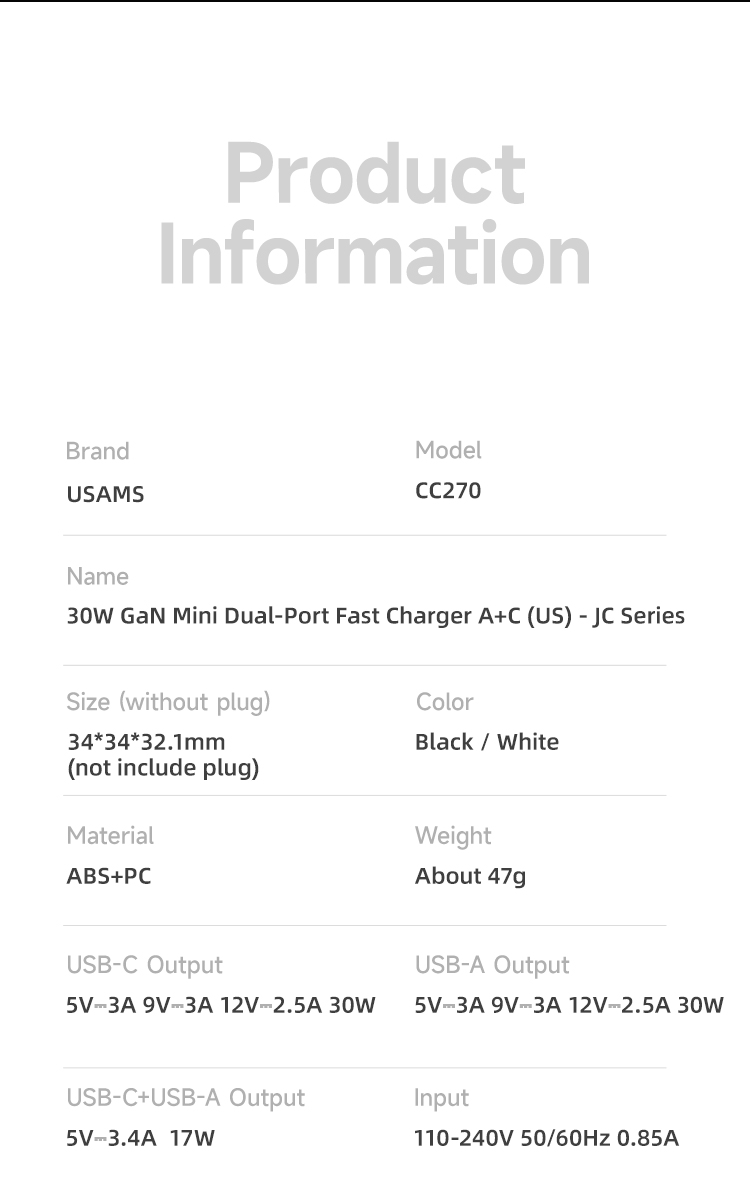 CC270 30W GaN Mini Dual-Port Fast Charger A+C (US) - JC Series