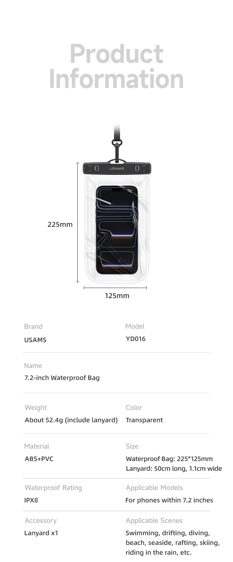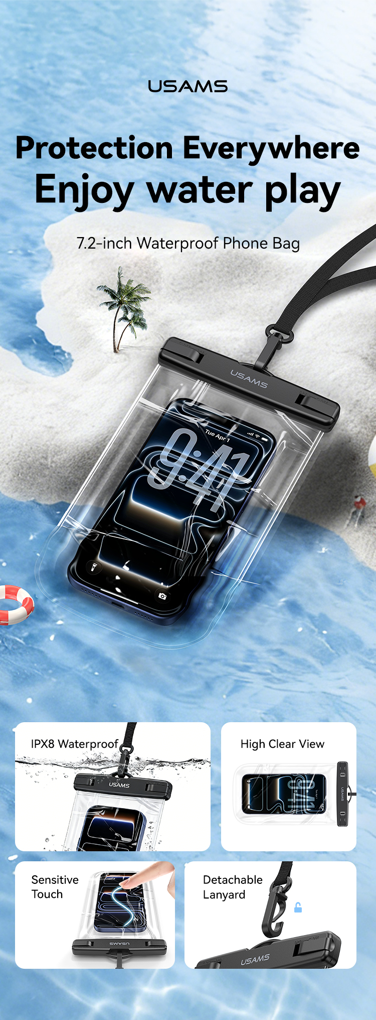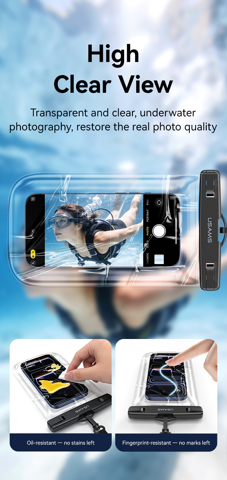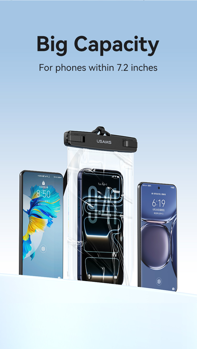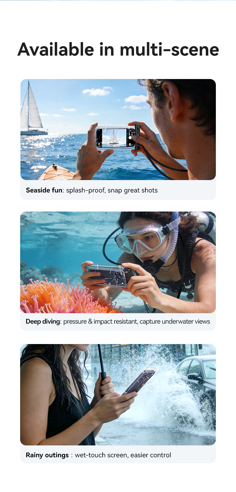 1、IPX8 Waterproof 2、High Clear View 3、Sensitive Touch 4、Detachable Lanyard