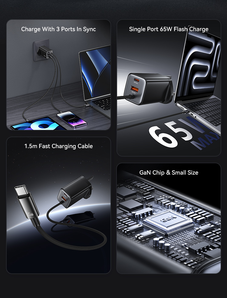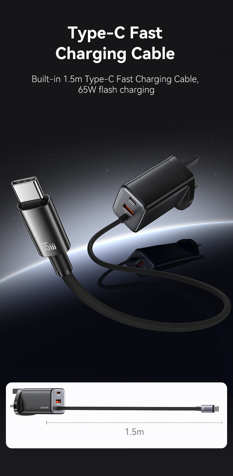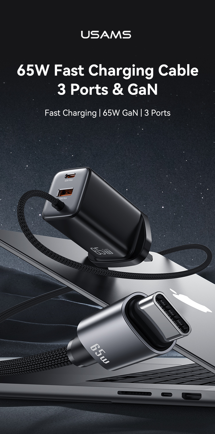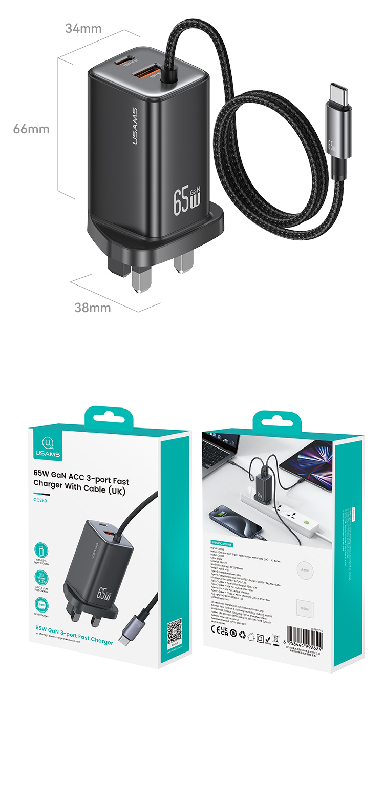 CC280 65W GaN ACC 3 Ports Fast Charger With Cable (UK) -JC series