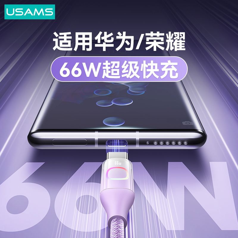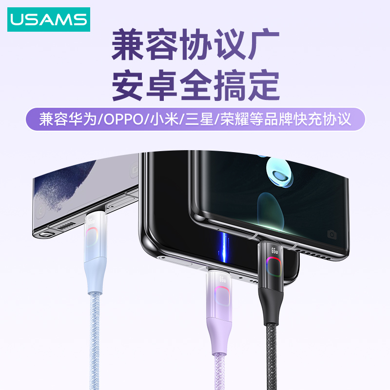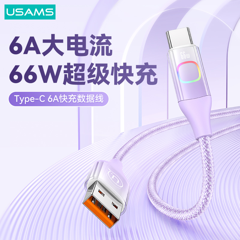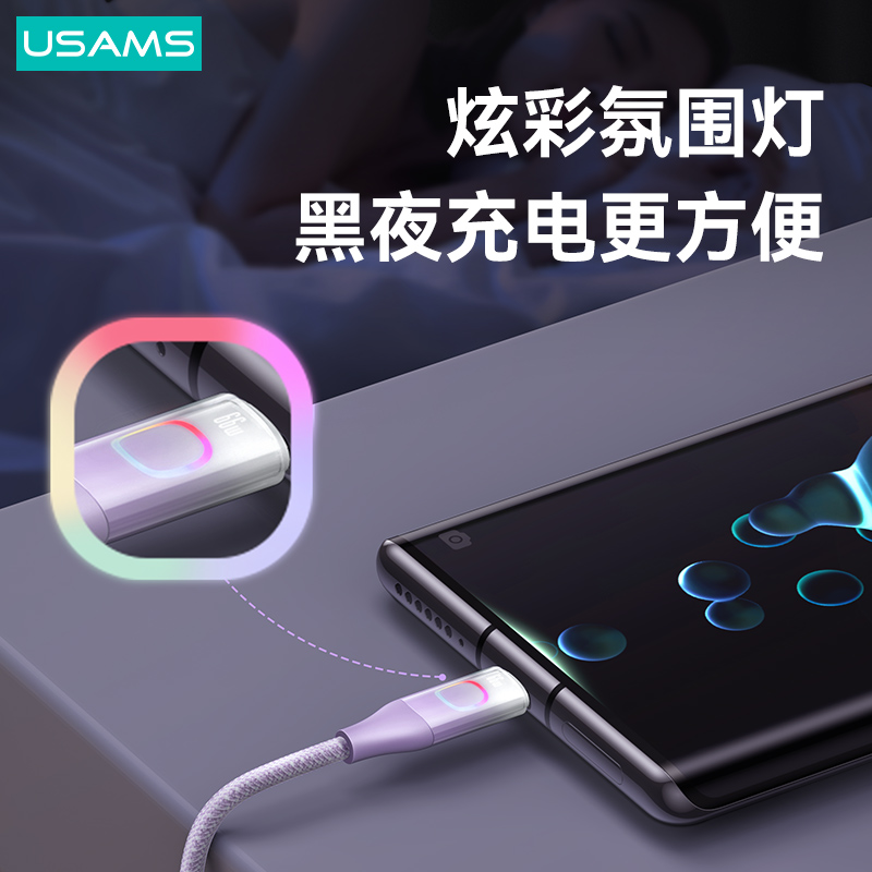 产品特点:① 6A大电流,快速充电不发烫② 充电+数据传输,功能二合一③ 耐磨尼龙编织线,魔术贴方便收纳④ 酷炫七彩灯,夜间充电易找线
