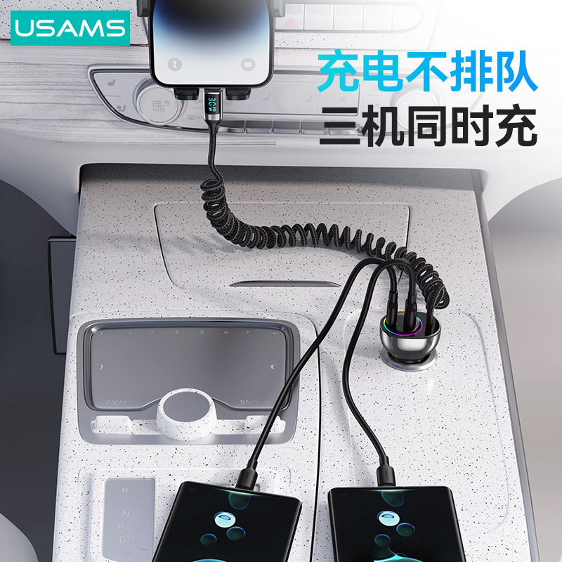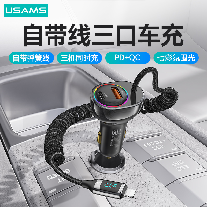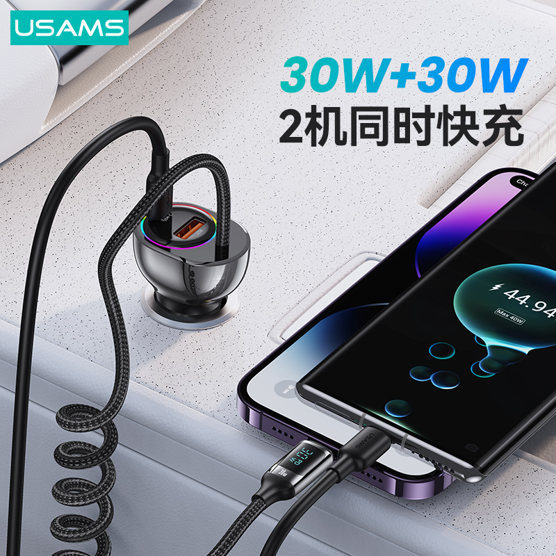 C37 60W锌合金U+C双口快充带数显Lightning PD30W伸缩线七彩灯车载充电器