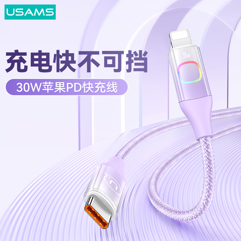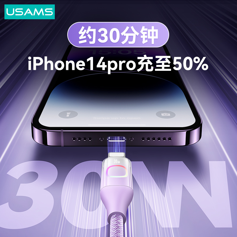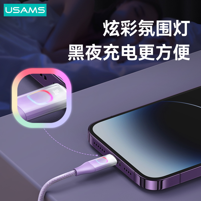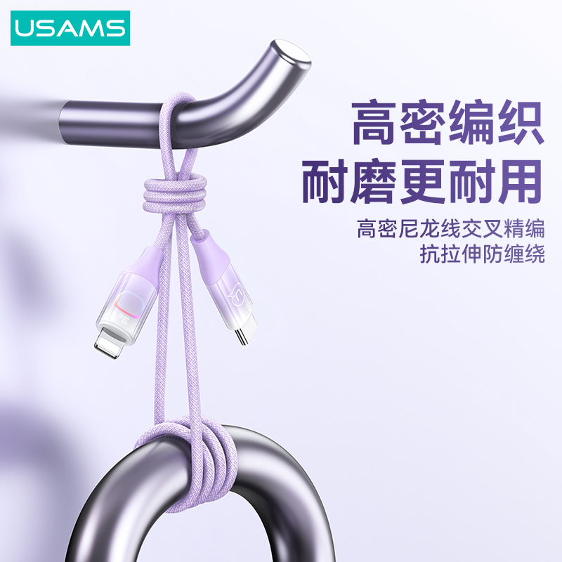 产品特点:① PD30W大功率,边充边玩不发烫② 充电+数据传输,功能二合一③耐磨尼龙编织线,魔术贴方便收纳④酷炫七彩灯,夜间充电易找线