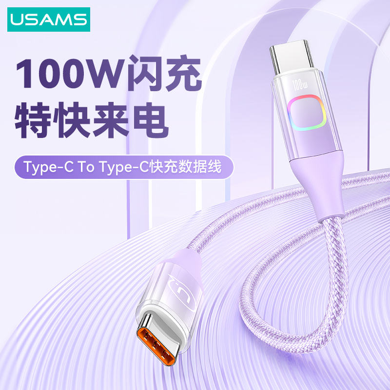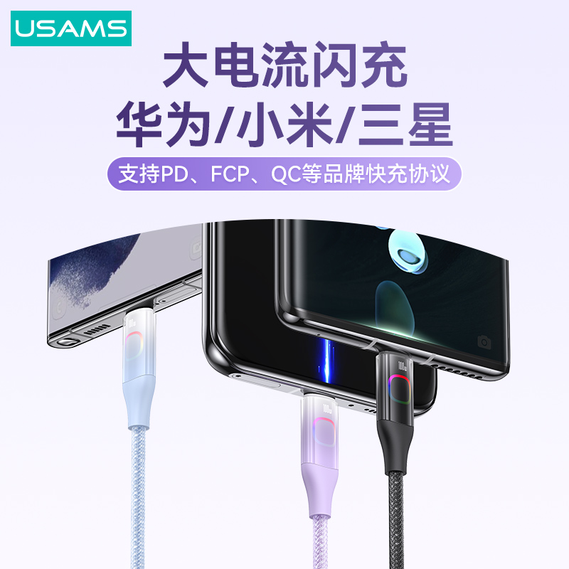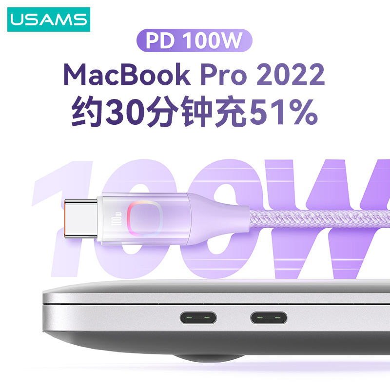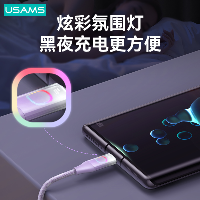 产品特点:① 100W大功率,快充笔记本/平板/手机② 充电+数据传输,功能二合一③ 强韧尼龙编织线,魔术贴方便收纳④ 酷炫七彩灯,夜间充电易找线