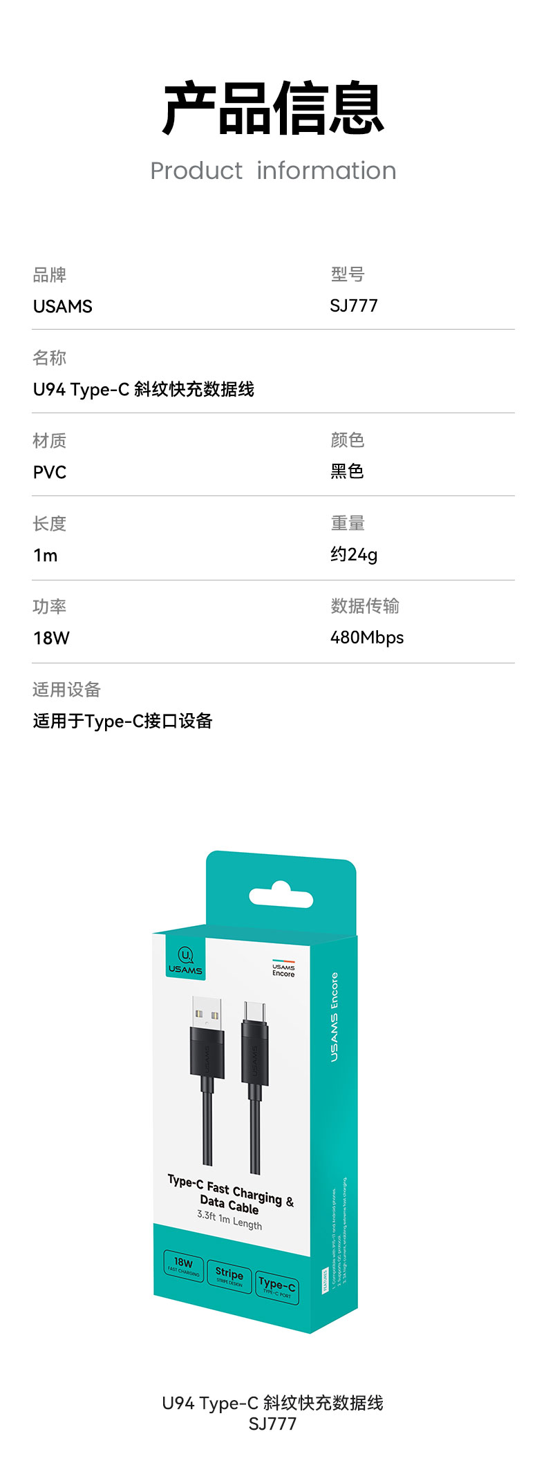 SJ780 U94 Type-C to Type-C斜纹快充数据线