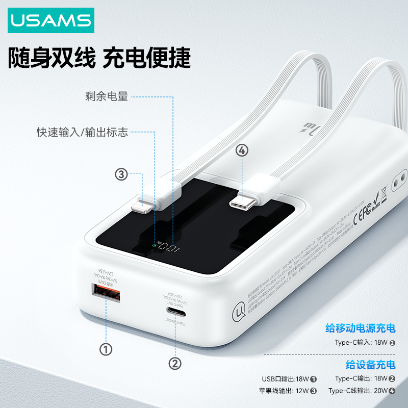 PD20W+QC3.0 双口快充带双线大屏数显挂绳款移动电源20000mAh/30000mAh