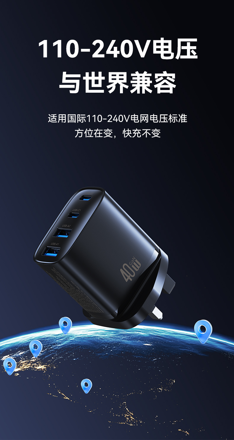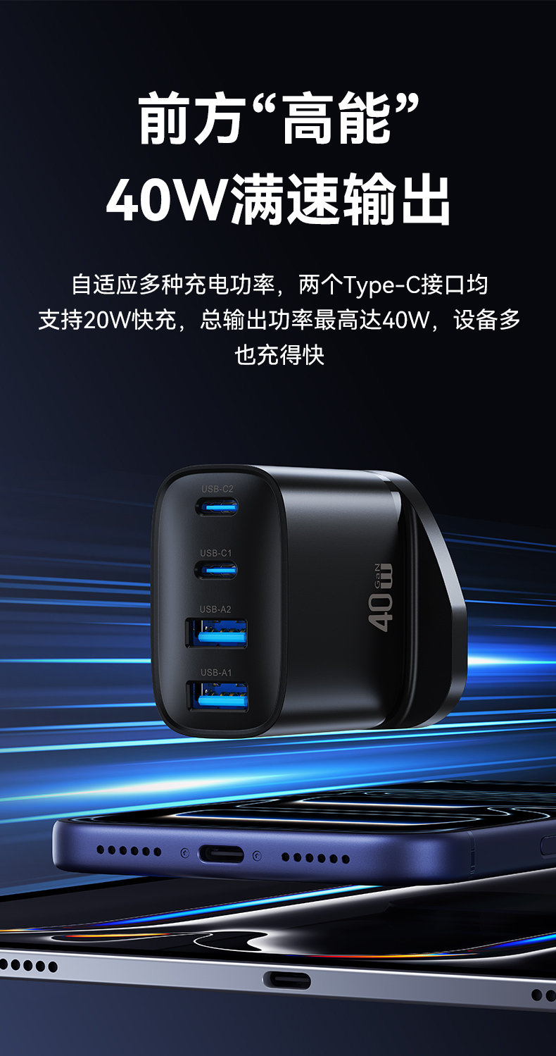 CC330 T70 40W四口A+A+C+C氮化镓快充充电器 欧规
