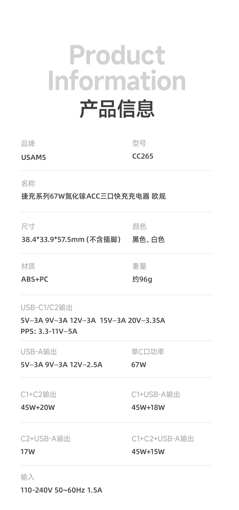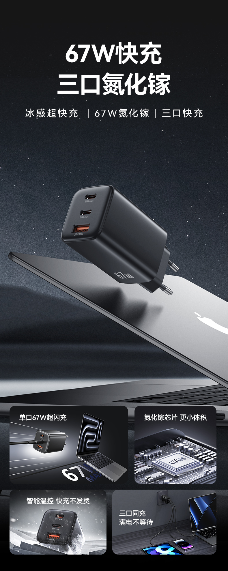CC265 捷充系列67W氮化镓ACC三口快充充电器 欧规