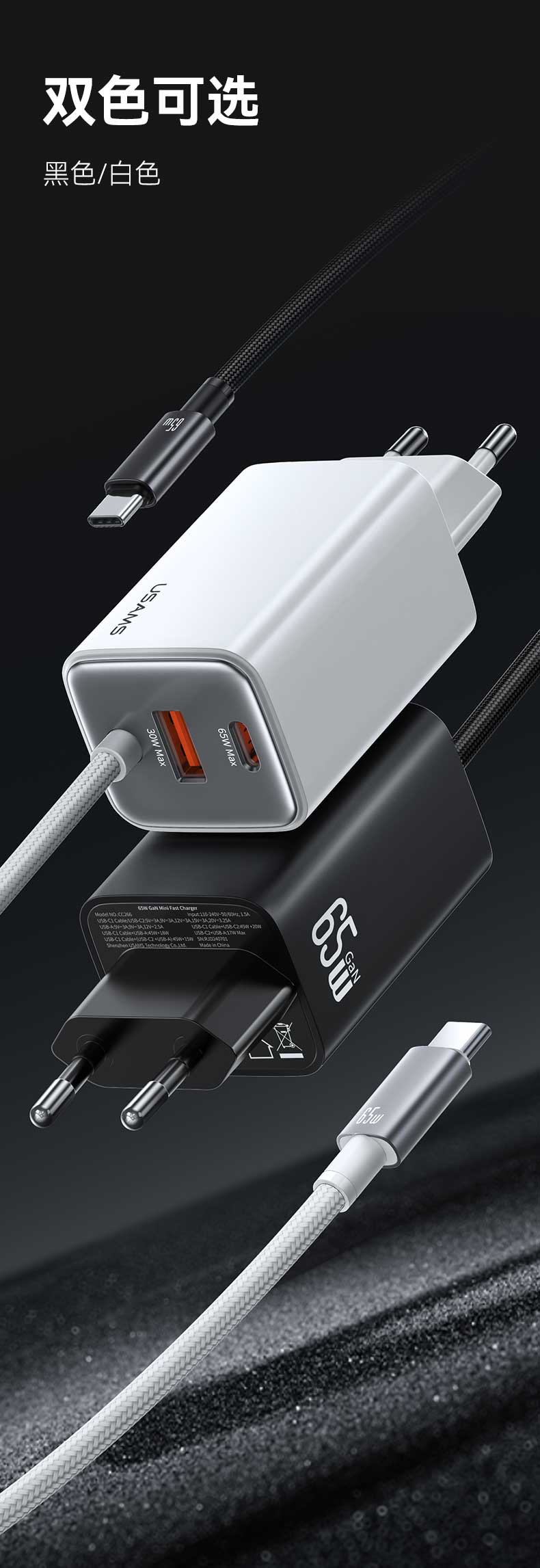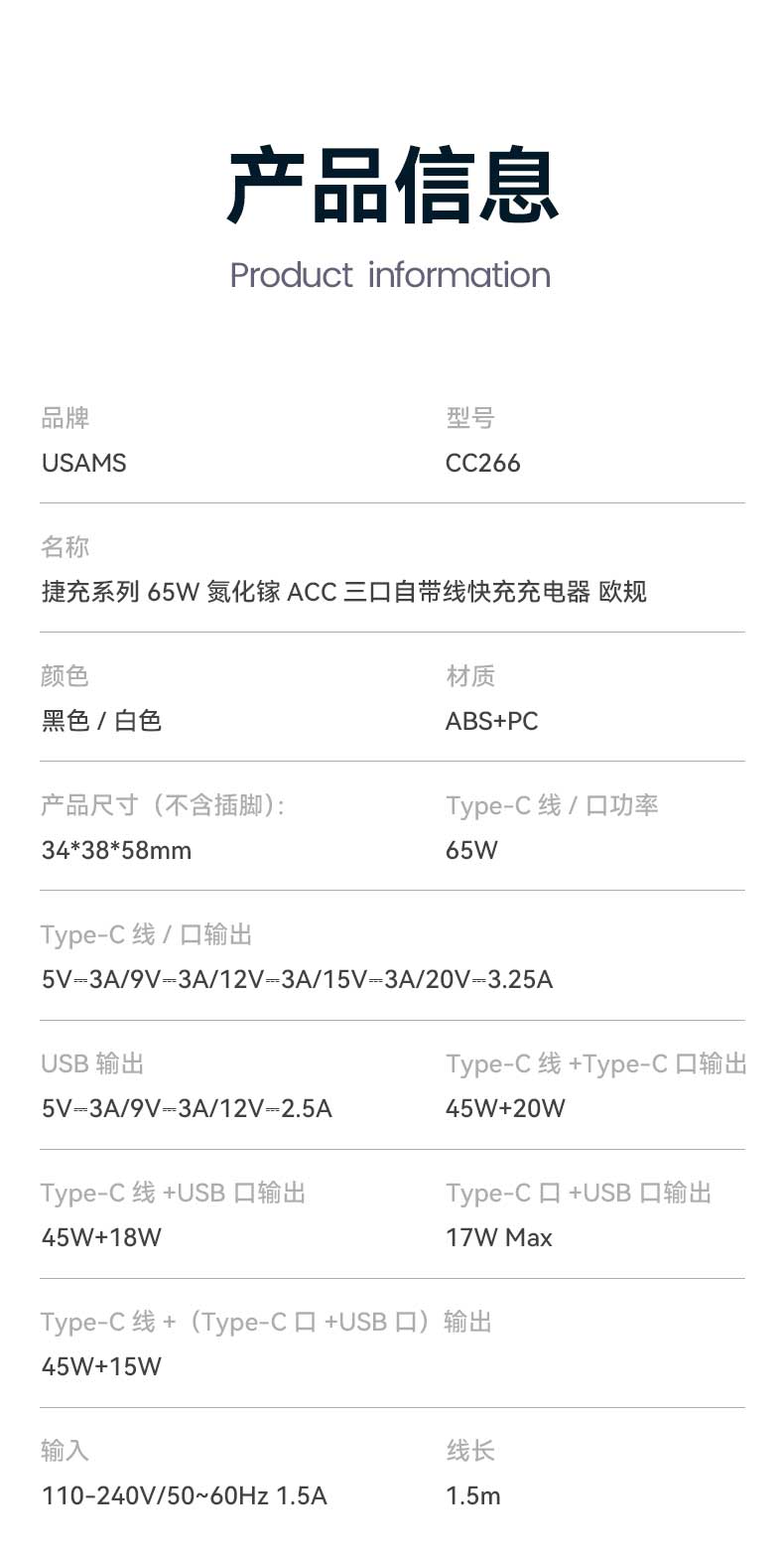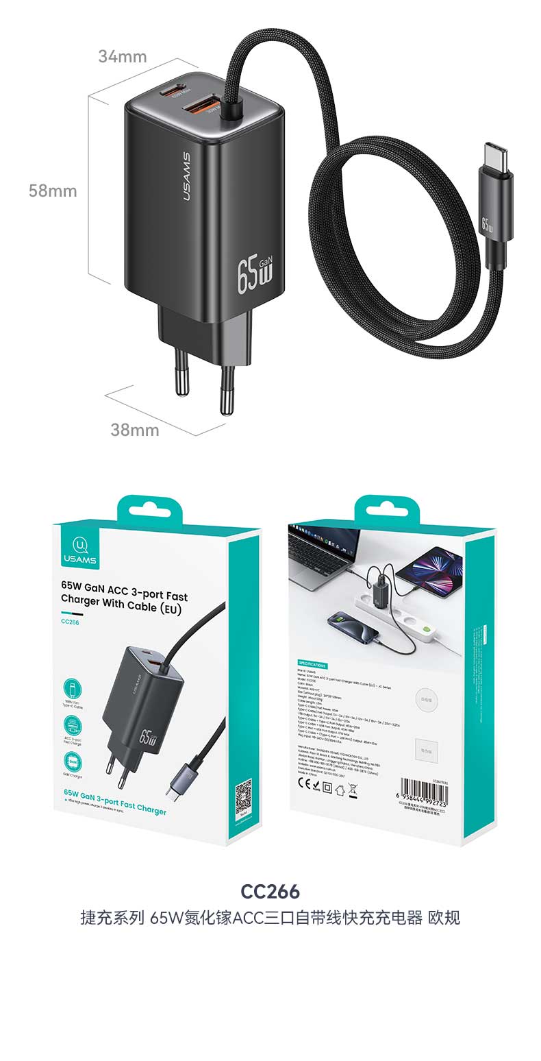 CC266 捷充系列 65W氮化镓ACC三口自带线快充充电器 欧规