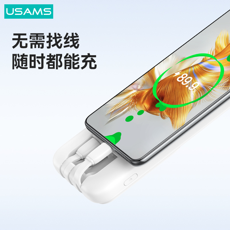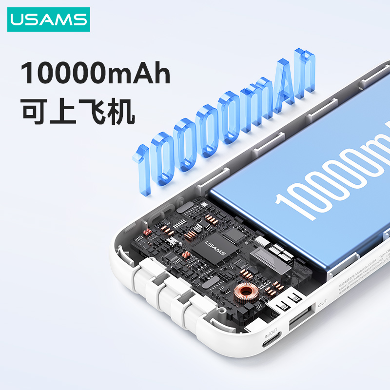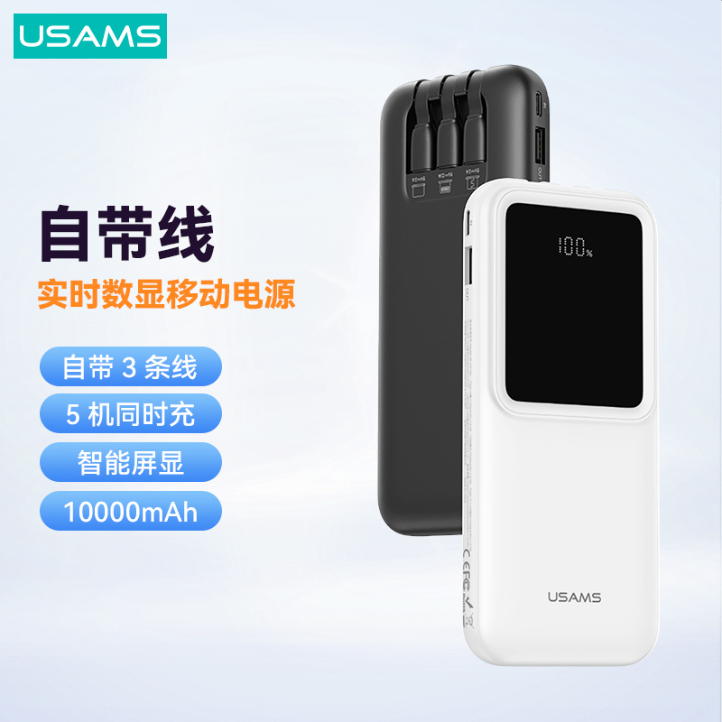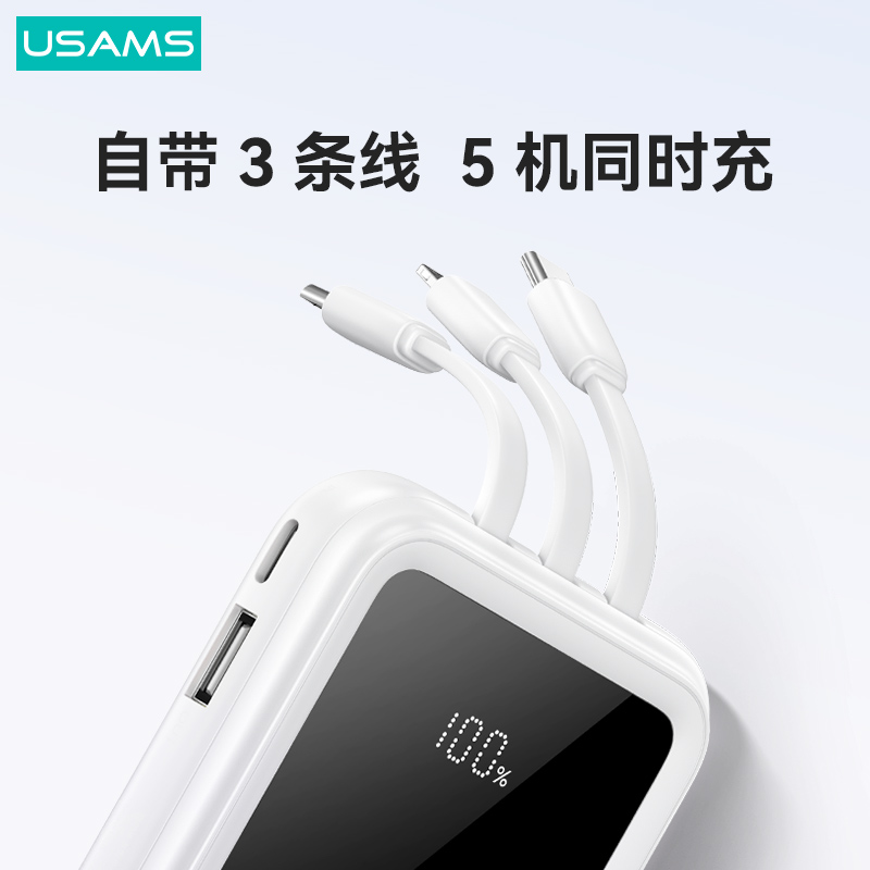 产品特点:①10000mAh大容量,可充多次②自带3条线,无需找线更方便③ 双口+自带线,五机同时充④ 屏显剩余电量,轻薄好携带