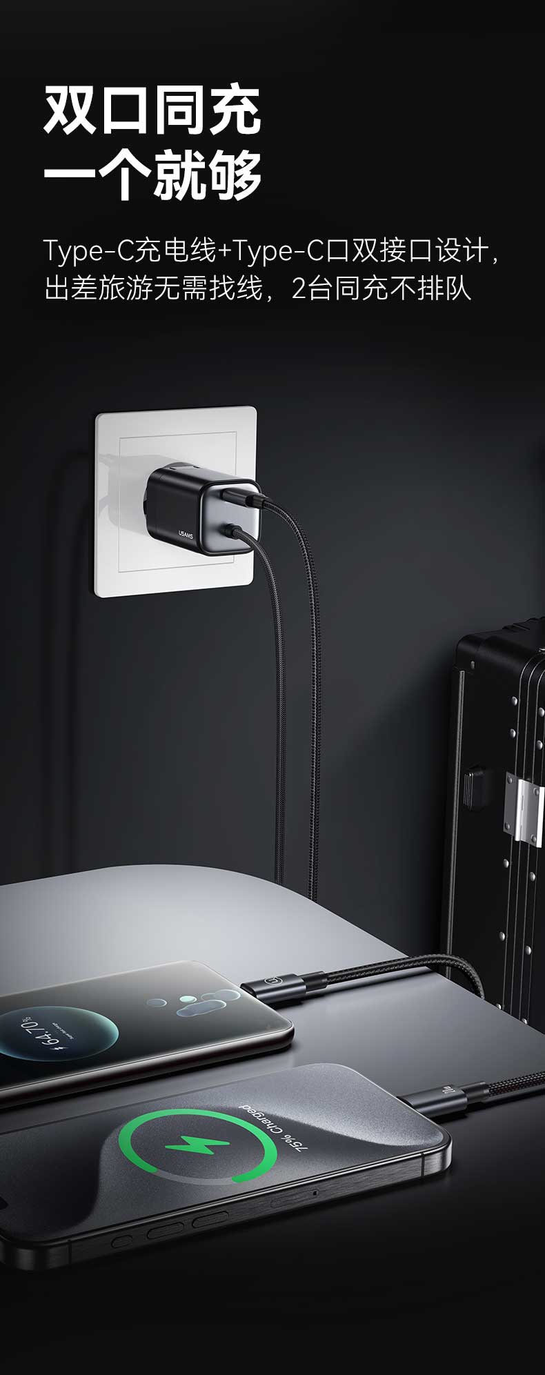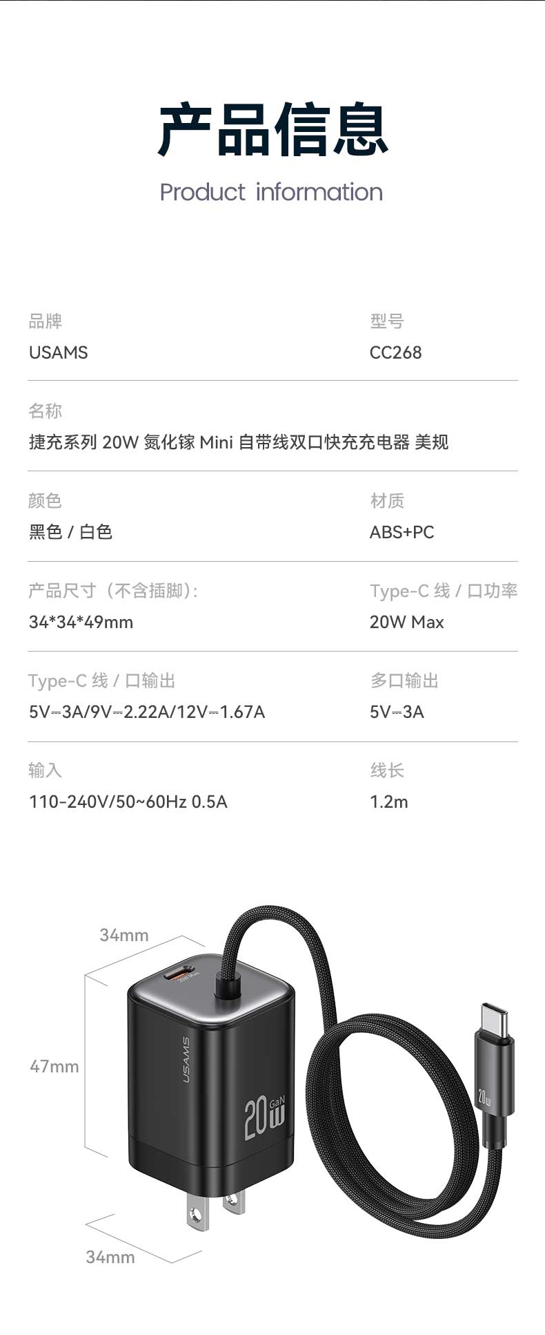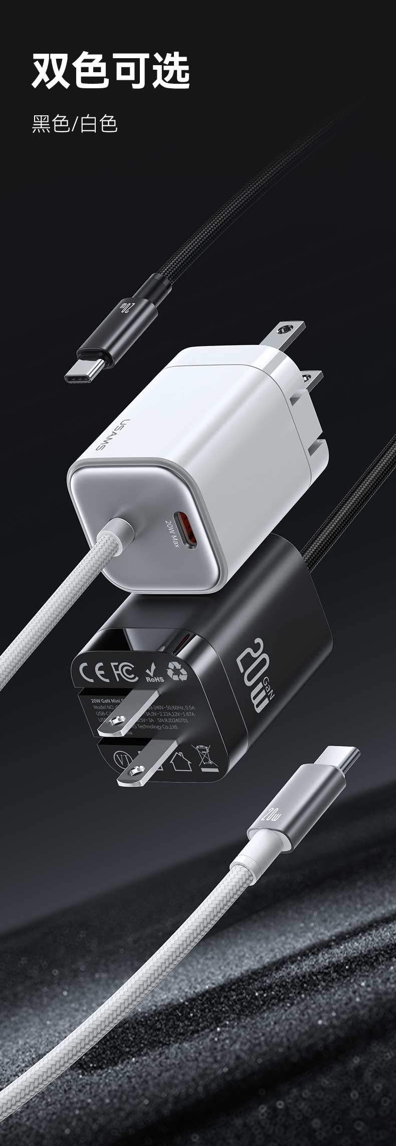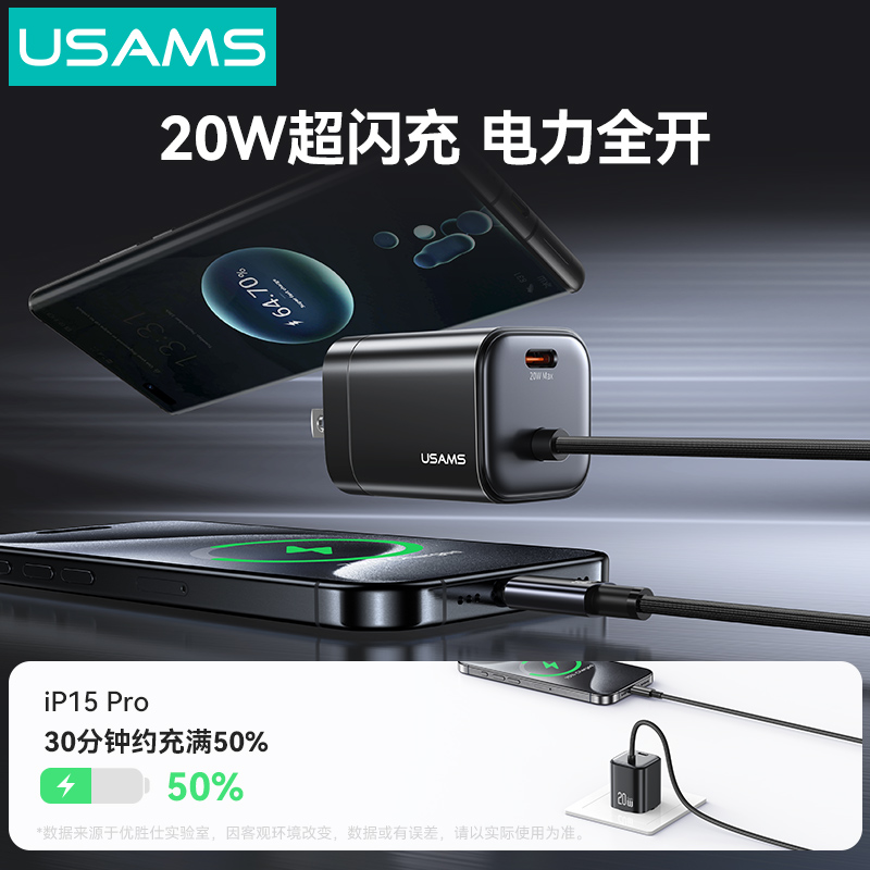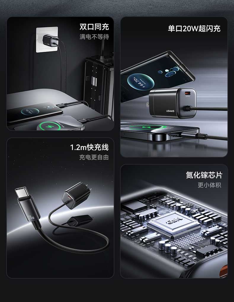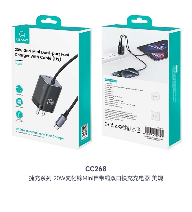 CC268 捷充系列 20W氮化镓Mini自带线双口快充充电器 美规